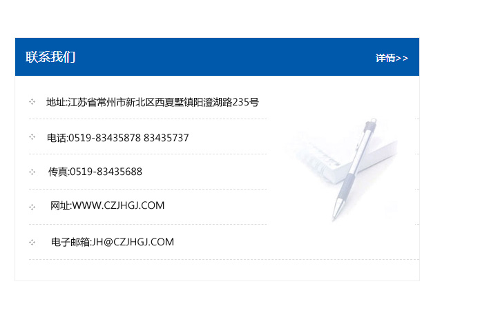 地址:常州市新北區友邦商務大廈1幢16、17層  電話:0519-85101652  傳真:0519-85112595  郵編:213022  網址:www_cz-jiayue_cn.cq1766.com  郵箱:xiajifengaa@163.com